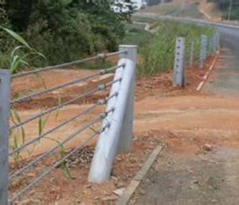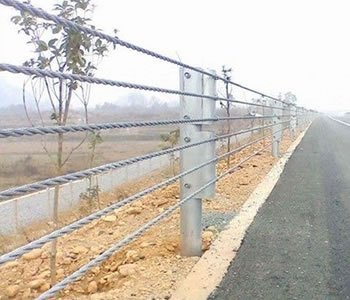 六索缆索护栏是缆索护栏的一种,其由六根缆索组成公路上面的防撞护栏。路侧缆索护栏的防撞等级分为A级和s级两类,S级护栏属加强型,适用于危险路段。中央分隔带的缆索护栏的防撞等级分为A级。埋置条件可分为埋设于土中和混凝土中两类,立柱无法打人的地方和路基填土不能保证立柱埋置深度的地方采用混凝土基础的办法。而六索缆索护栏是缆索护栏的加强型,采用六根具有较高强度和抗腐性能优良的3×7镀锌/右凝构造钢索。